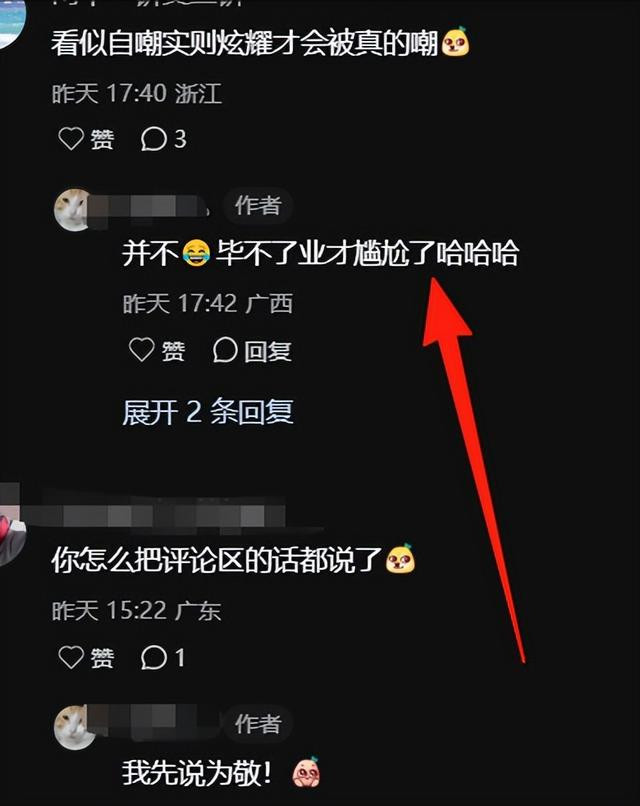 不过大家觉得如果是在自嘲,但实际是想炫耀的话,那才会真的被嘲笑。而这个时候女生又说了另外一句发人深省的话,那就是如果毕不了业才是真正的尴尬,那时候才会丢人呢。