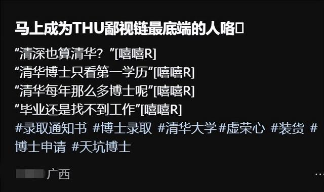 比如“清华博士只看第一学历,清华每年那么多毕业的博士,毕业了不照样还是找不到工作”之类的话。因此她就自嘲说自己反倒成了清华的底层人。
